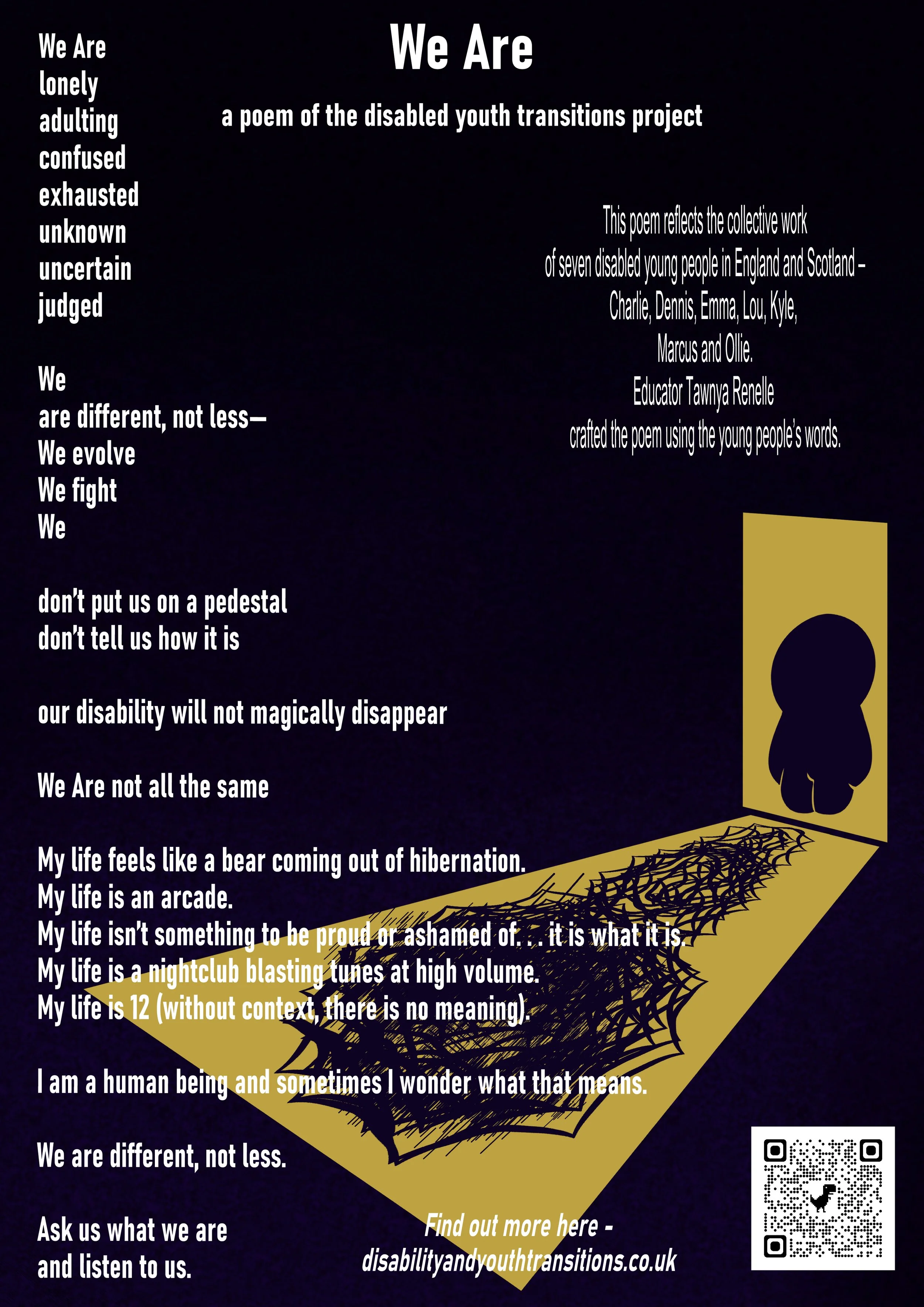 During the project disabled young people in both Scotland and Northern England took part in a range of individual and collective creative activities designed to explore different aspects of their lives. They chose what they wanted to do and what they wanted to share with us and with others outside the project. A small group met online, supported by a creative writing practitioner Tawnya Renelle, to produce a collective poem called ‘We Are’. All the words are those of the young people - Charlie, Dennis, Emma, Lou, Kyle, Marcus and Ollie. The poem captures much of what many research participants shared with us in a way our words cannot do justice to. We present the poem here in different formats as a Key Finding written by participants. The graphic design has also been done by one of the participants in the project.
