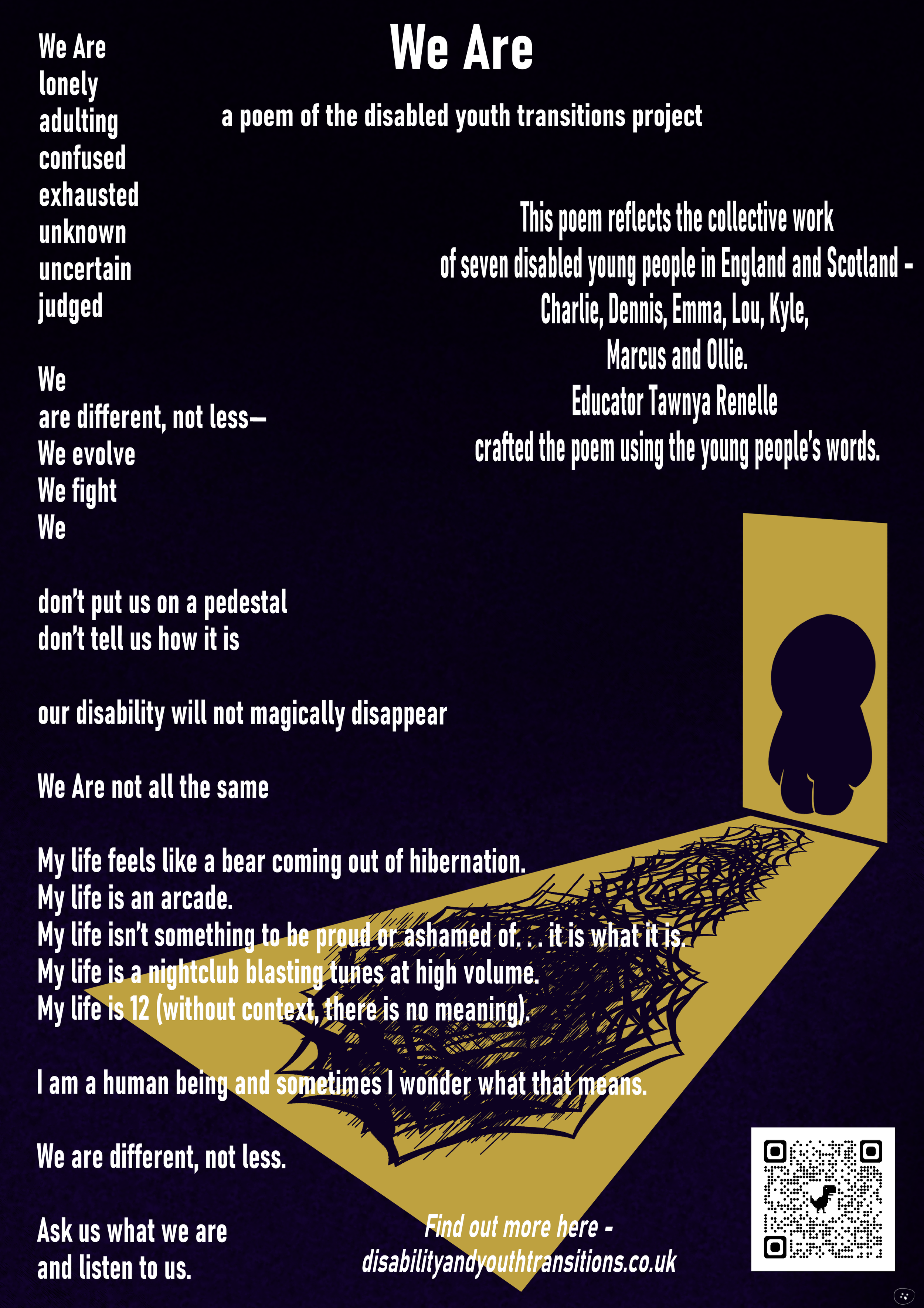 During the project disabled young people in both Scotland and Northern England took part in a range of individual and collective creative activities designed to explore different aspects of their lives. They chose what they wanted to do and what they wanted to share with us and with others outside the project. A small group met online, supported by a creative writing practitioner Tawnya Renelle, to produce a collective poem called ‘We Are’. All the words are those of the young people - Charlie, Dennis, Emma, Lou, Kyle, Marcus and Ollie. Rabbit, one of the participants on the project also did the graphic design. The poem captures much of what many research participants shared with us in a way our words cannot do justice to. We present the poem here in different formats as a Key Finding written by participants.